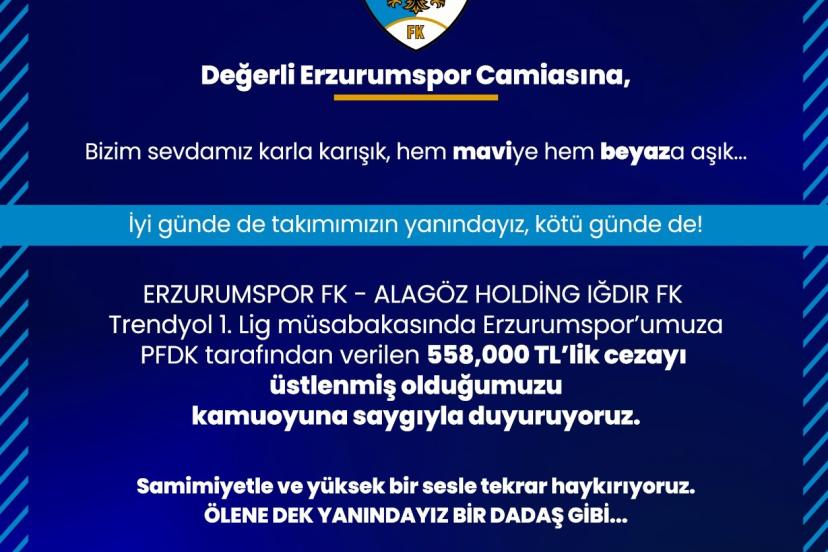 Hafta sonunda Erzurum’da oynanan Iğdır FK karşılaşması sonrası PFDK tarafından Erzurumspor’a verilen 558 bin TL’lik cezayı üstleneceklerini açıklayan Başkan Küçükoğlu sosyal medya hesabından yaptığı paylaşımda , "Değerli Erzurumspor camiasına, Bizim sevdamız karla karışık, hem maviye hem beyaza aşık. İyi günde de takımımızın yanındayız, kötü günde de! Erzurumspor Fk - Alagöz Holding Iğdır Fk 1. Lig müsabakasında Erzurumspor’umuza PFDK tarafından verilen 558,000 TL’lik cezayı üstlenmiş olduğumuzu kamuoyuna saygıyla duyuruyoruz. Samimiyetle ve yüksek bir sesle tekrar haykırıyoruz. Ölene dek yanındayız bir dadaş gibi" ifadelerine yer verildi.