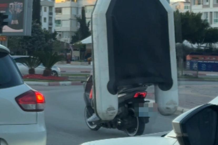 KONYAALTI ilçesinde motosikletle seyir halindeki iki kişinin şişme bot taşıdığı anlar cep telefonu kamerasıyla kaydedildi.
